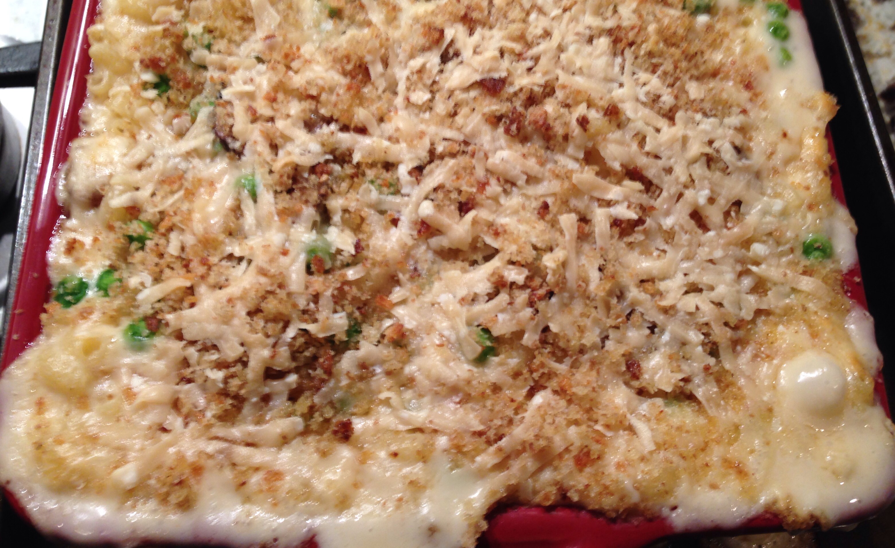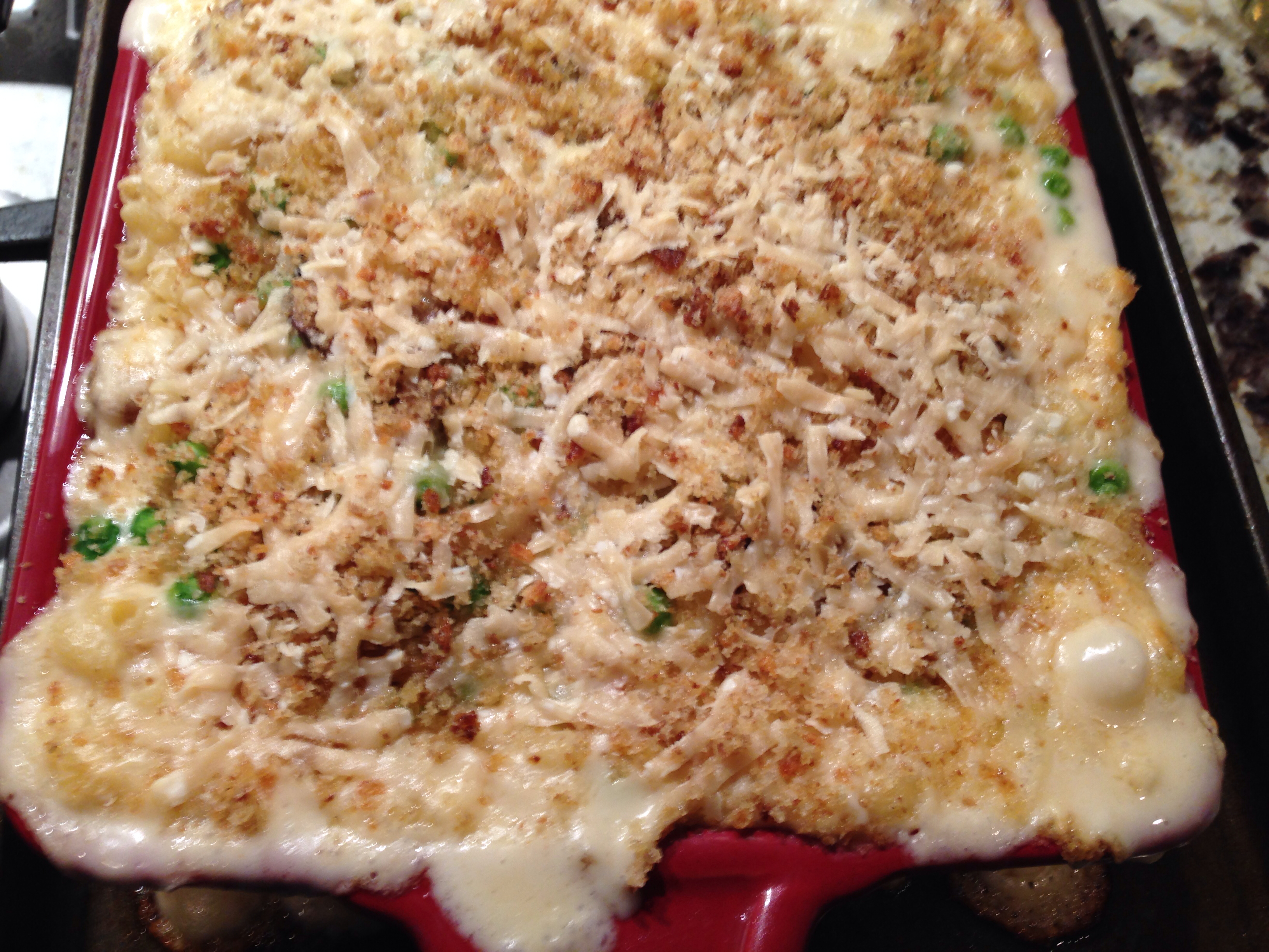 I start by sautéing some sliced mushrooms with onions and add chopped garlic at the end. After that, I make Mornay sauce which is basically Bechamel sauce with cheese added and melted at the end. It’s easy…promise. It just sounds complicated. Otherwise, you just unthaw some frozen peas, mix everything together and place in a casserole dish with bread crumbs and some parmesan over the top and finish it all in the oven for 20 minutes or so. I garnish with Italian parsley for color. You don’t have to if you don’t wish.