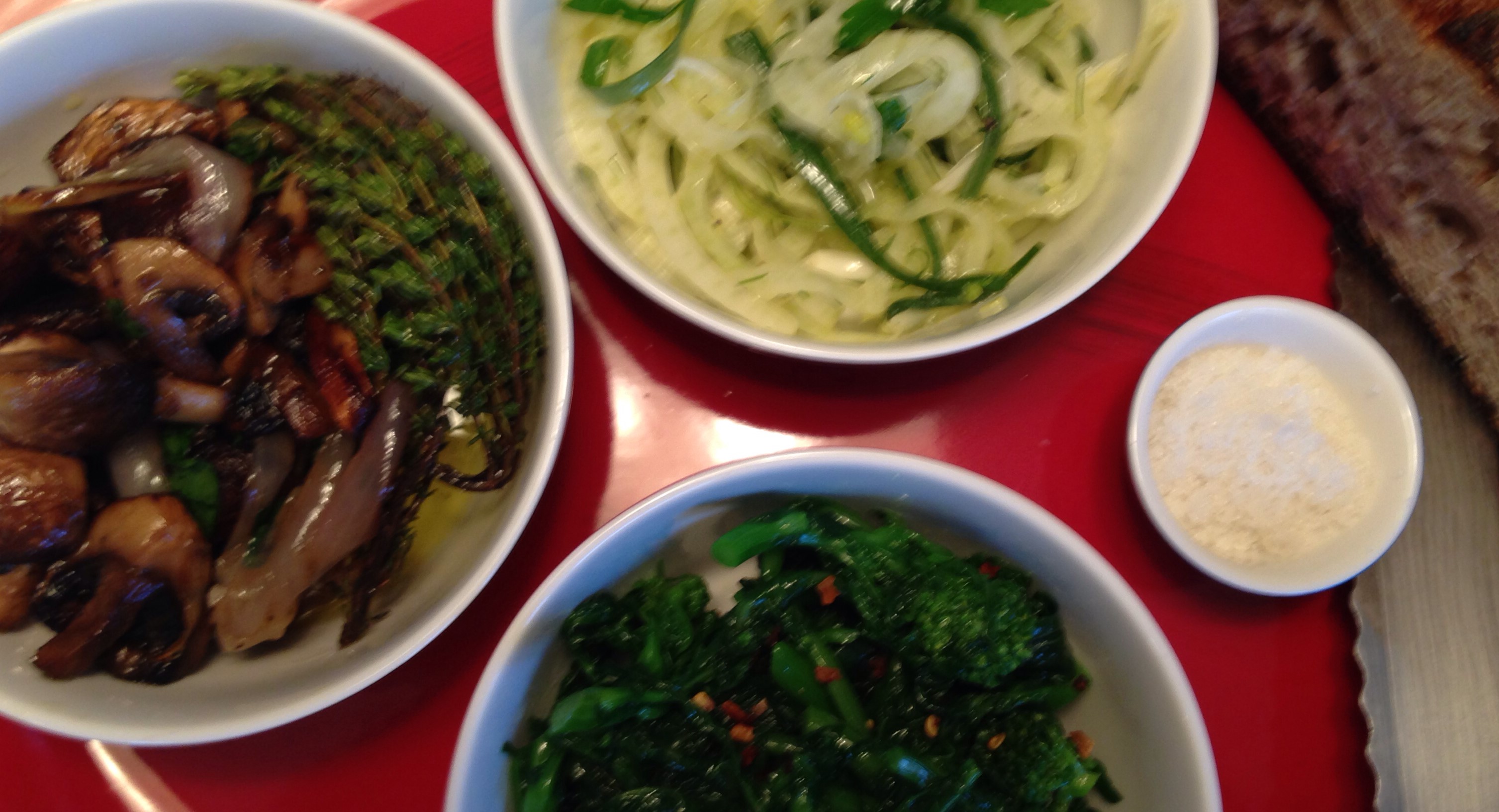 I made this basic dish for a neighborhood gathering last week and it seemed to be a hit. A couple neighbors even asked for the recipes of the various toppings. The stars here are ingredients that I either purchased directly from the Farmer’s Market in Summit or received from the farm via the Just Farmed program out of Westfield. I showcased local, seasonal ingredients: broccoli rabe, baby fennel, spring onions, and mushrooms. I also utilized three different cooking techniques: roasting, sauteing, and marinating raw vegetables. In doing so, the flavors and textures of the three dishes really became distinct, unto themselves. This dish can be completed easily within an hour if time is utilized properly. The vegetables can be made ahead of time as all three are served either warm or at room temperature. Serve with toasted bread drizzled with olive oil and accented with salt and pepper or simply serve with fresh, crusty bread cut thickly so that it can stand up to the heaviness of the toppings.  The recipes as well as a zoomed in photo of the veggies  follow after the jump!
