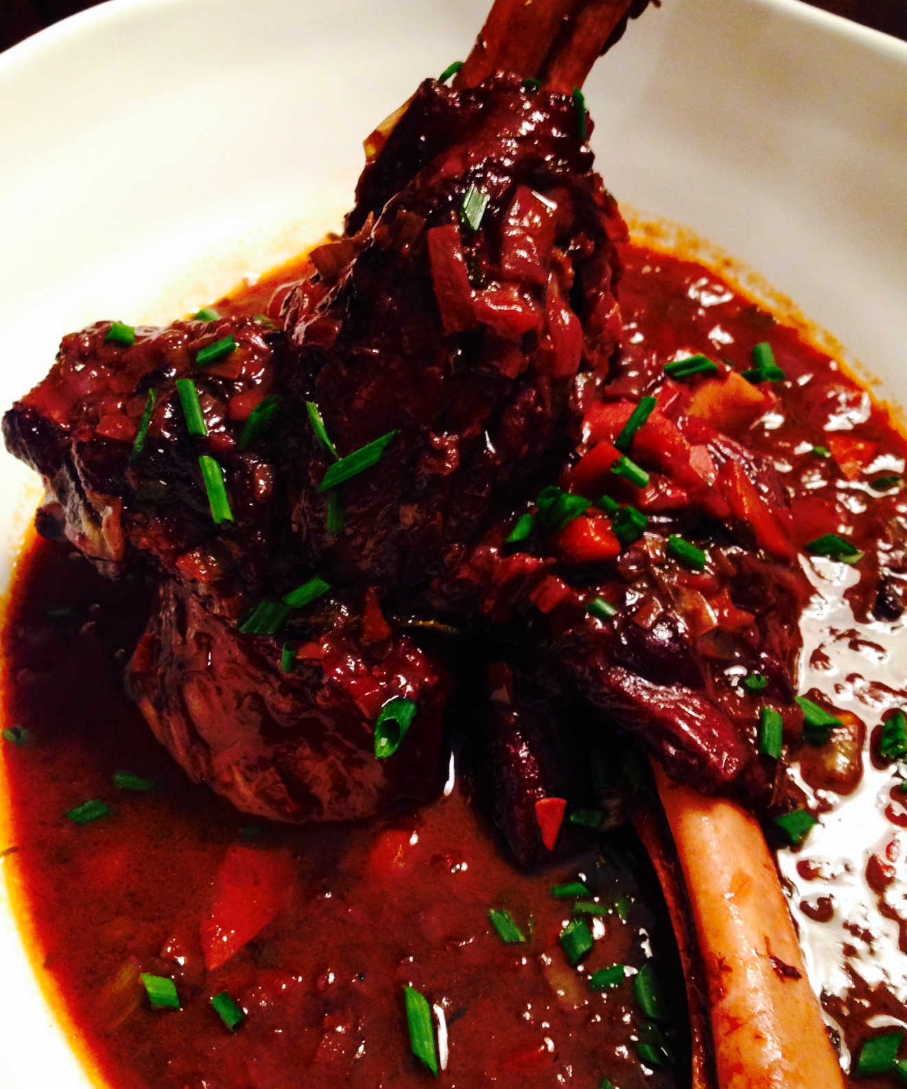 My wife asked me to make lamb for her birthday recently, so I gave it some thought and decided to make lamb shanks. Lamb shanks are great braised and the slow cooking in a sauce is a perfect complement to the coming colder weather. Here, I used a red wine and homemade veal stock as the braising liquid and complemented that with an assortment of herbs and vegetables. Braising takes a while to do…hours really. However, it’s a great thing to do on a leisurely weekend where you have a few hours. Once you sear the meat and brown the vegetables, the rest of the work is done with the pot covered and simply allowing it to simmer away until the meat becomes tender and the liquid thickened and reduced. I served the lamb shanks over a puree of cauliflower (my wife’s request and it was great) and a quick sauté of some kale. However, you can certainly serve this with polenta, pasta, mashed potatoes or a root vegetable mash. Grains would be great here too. Really, anything that can stand up to a strong, thick liquid would be perfect.