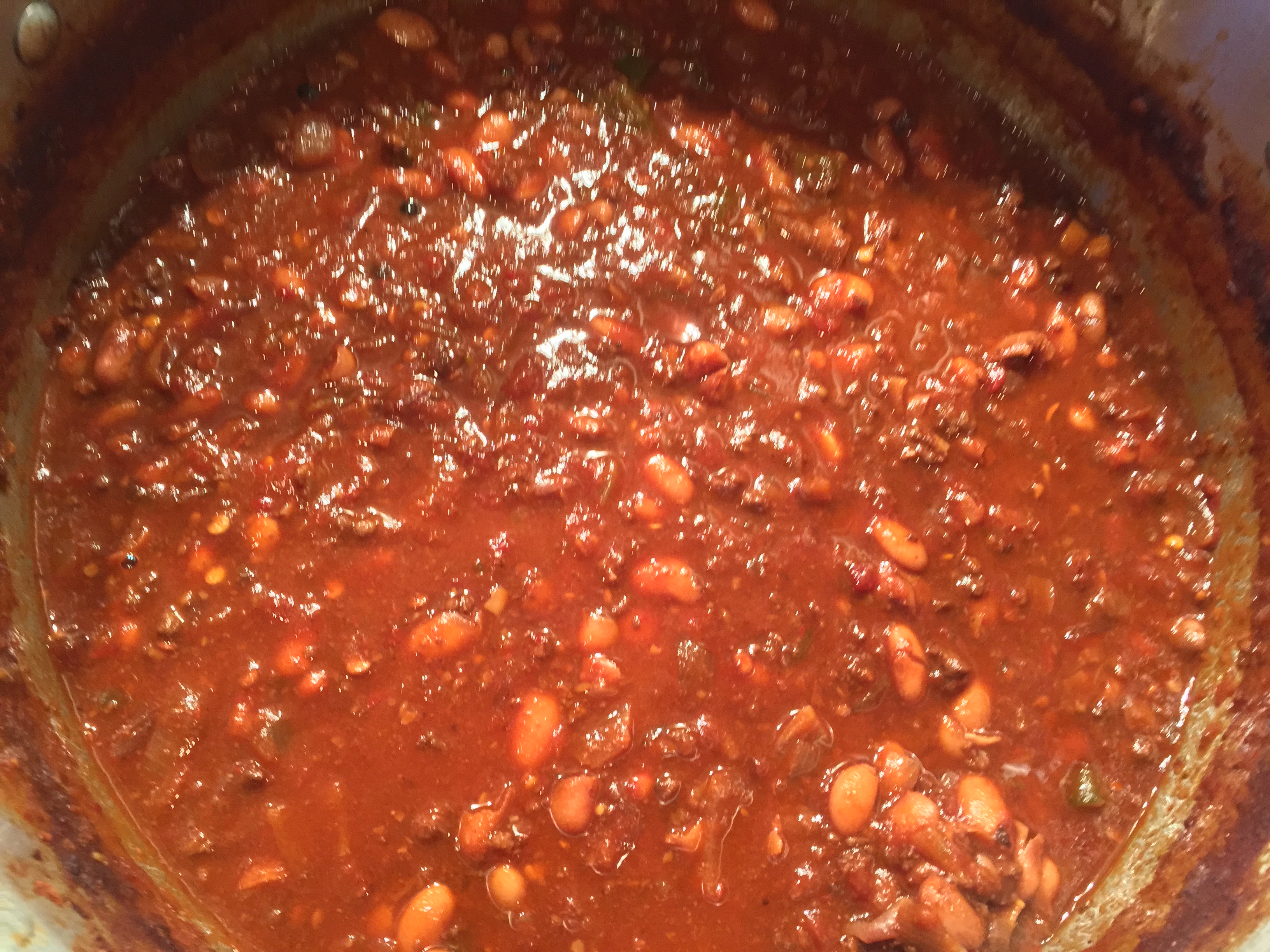- Allow to simmer for about 2 hours, checking the chili every 20-30 minutes to stir. Add more of the water from the chili peppers as necessary to keep mixture loose (but not soupy).
