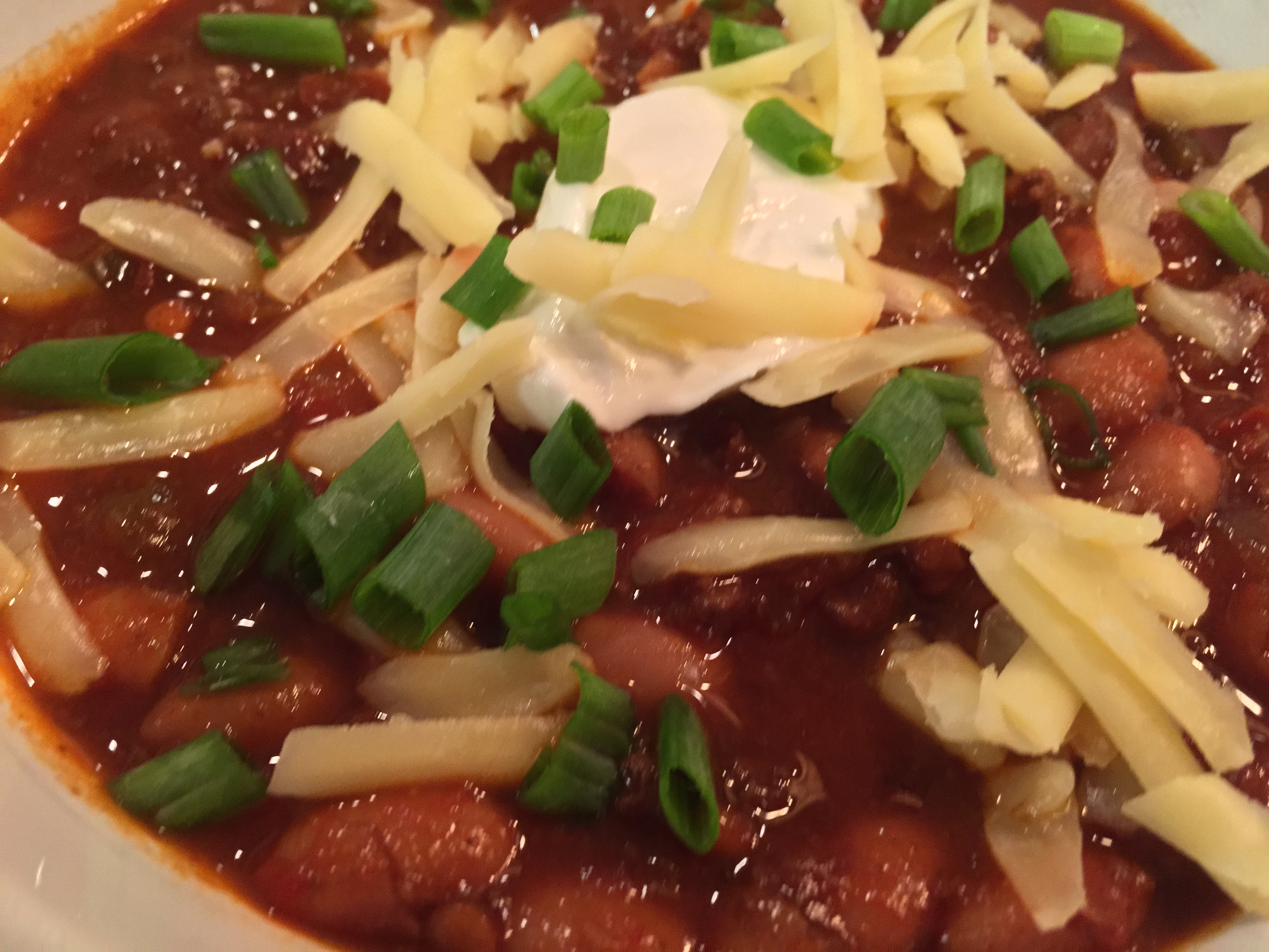 I really like chili and I really enjoy making it a couple times each year during the cool and cold weather months. I love the spiciness of it and I love the fact that you can add a bit of this and a bit of that. Many people prefer their chili simply cooked with dried spices, dried chili pepper powder, and ground beef. Living in Texas for some time, I became well acquainted with this approach and while I like it, I don’t love it. I much prefer beans in my chili and I certainly like the taste and health benefits they bring. The beans, coupled with vegetables such as onions, bell peppers, and tomatoes make chili better for you and certainly more filling. I typically couple the chili with corn bread and a small salad or some sort. I almost always garnish with some grated cheddar cheese, chopped green onions, sour cream, and sometimes cilantro (though I didn’t use cilantro as a garnish here).