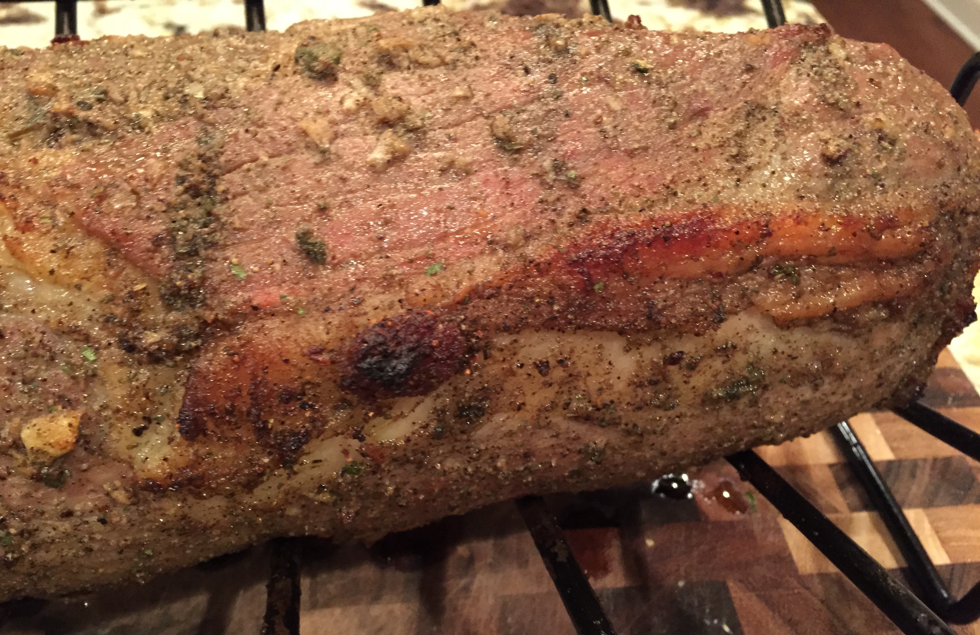 Two things before the recipe that I should mention. One, the good news is that this roast only takes about 20 minutes to cook the whole thing at 425 degrees. Two, the bad news is that the rub of all the seasonings and herbs needs to be done two days (48 hours) in advance of cooking it. So this involves a bit of planning to pull off. However, the saving grace about it is that once you create the rub and season the beef, you wrap it up, pop it in the fridge and it just sits soaking up all the flavor for a couple of days. It takes about 15 minutes to gather everything, make the rub, and season the beef. So all in all, not a whole lot of time to prepare. It does, though, require some forethought which may be inconvenient on occasion. So, with those two things in mind, here is my current favorite rare roast beef recipe. It’s almost exactly the recipe published in the book, just written in my own words with a few noted changes. Recipe follows after the jump…