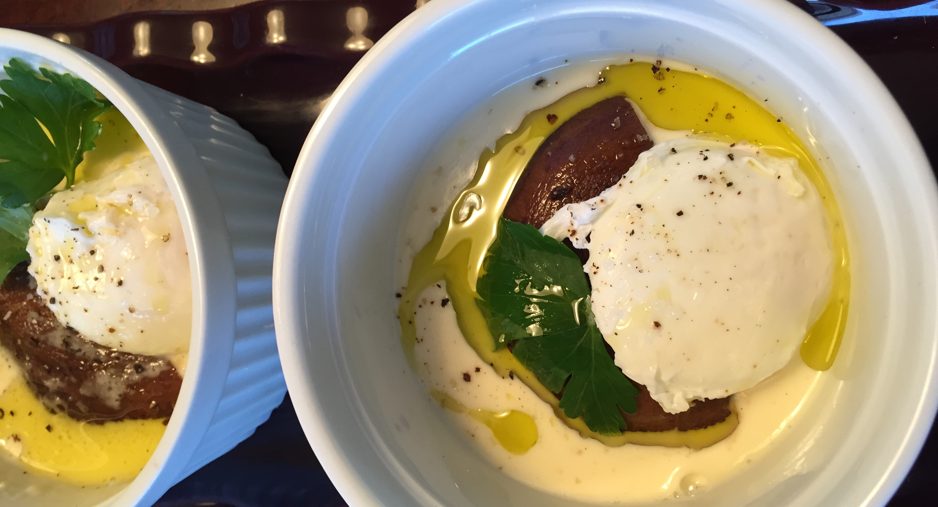 - Then carefully add one egg per person served. Add a leaf or two of Italian parsley. Drizzle lightly with the best quality olive oil you have and a touch of coarse sea salt and a very light grind of black pepper.