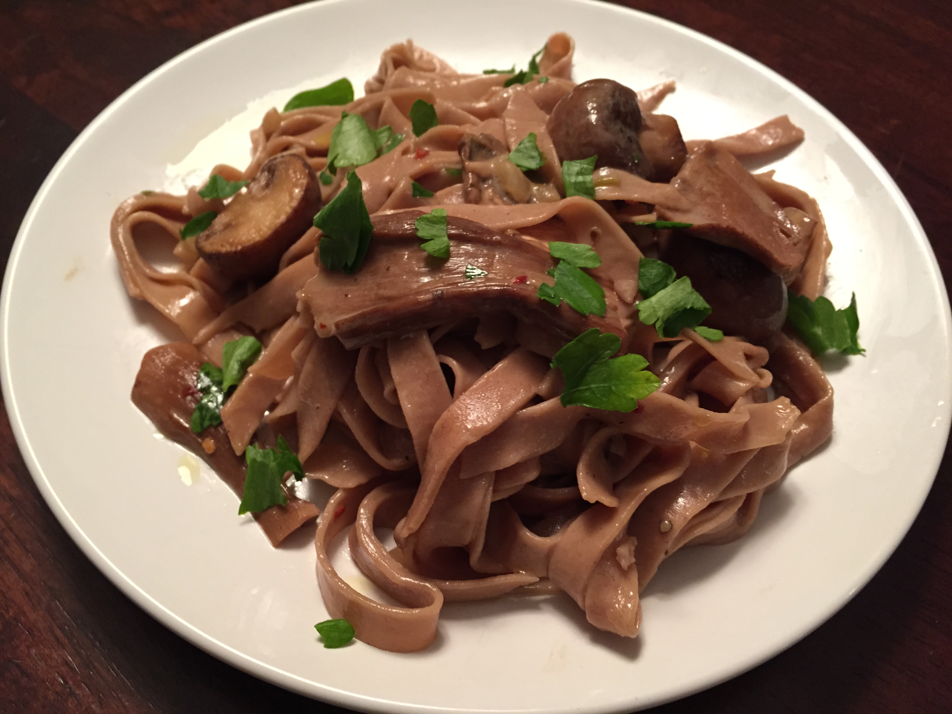 Chestnut pasta can be used in a variety of ways but classically it’s paired with mushrooms as the nutty earthiness of the pasta is enhanced by the earthiness of the mushrooms. The light cream sauce helps cut through some of the overpowering earthiness to bring a nice balance of flavor. Here, I used both dried (porcini) and fresh (crimini) mushrooms. Feel free to use all fresh or all dried or a combination of both. Also, fresh peas and other fresh vegetables are great to add to the mix. However, given the unique flavor of the chestnut pasta itself, I think everyone owes it to themselves to make a simple dish at first with just a few flavors and ingredients so that you can really savor the flavor and texture of this pasta and allow it to stand on its own. From there, go where your imagination takes you! Recipe and notes follow after the jump…