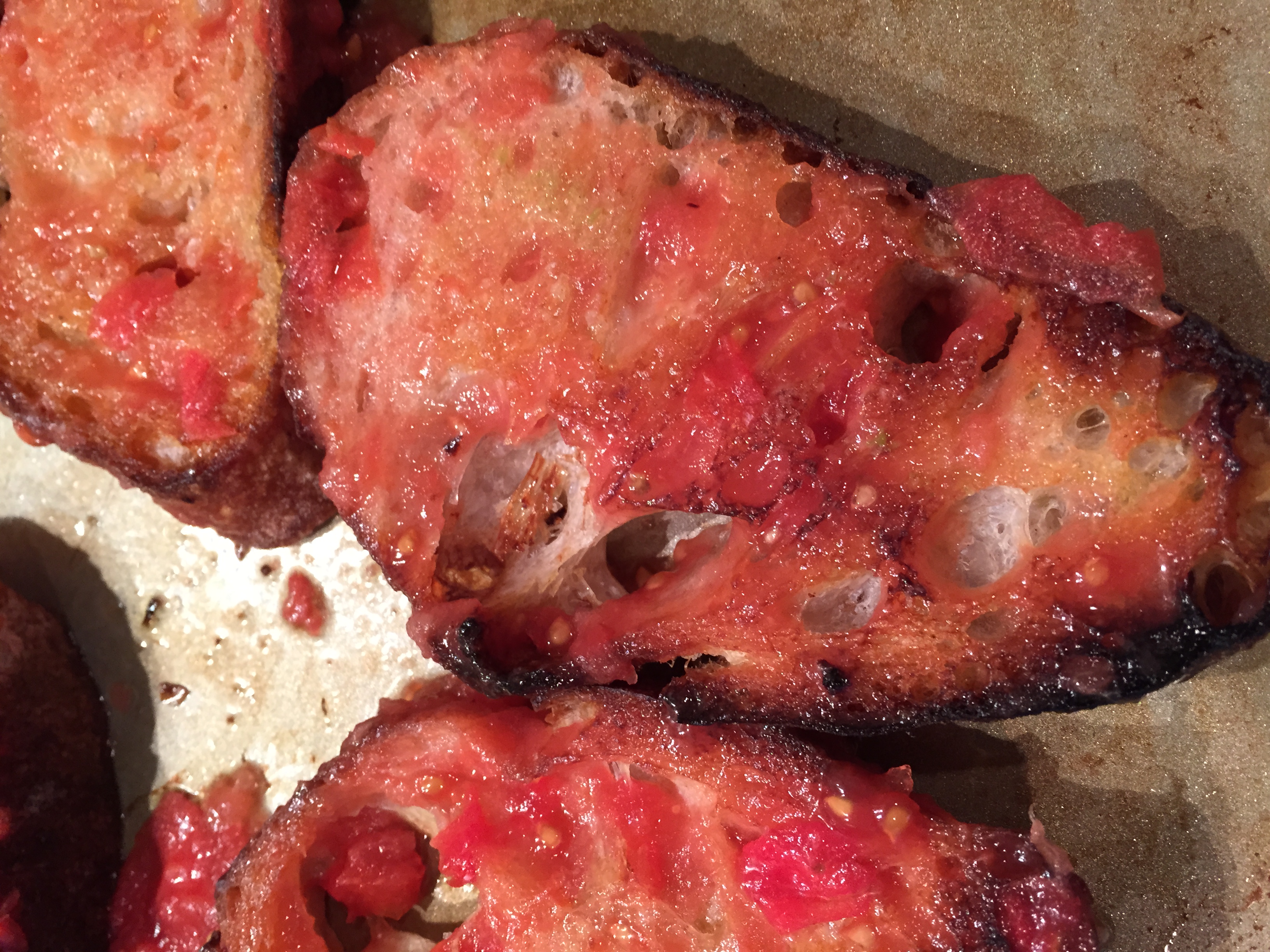 - Likewise, take one tomato half and rub it over the exterior of one side of the bread. It, too, will leave behind bits of tomato creating a thin paste like coating over the bread.