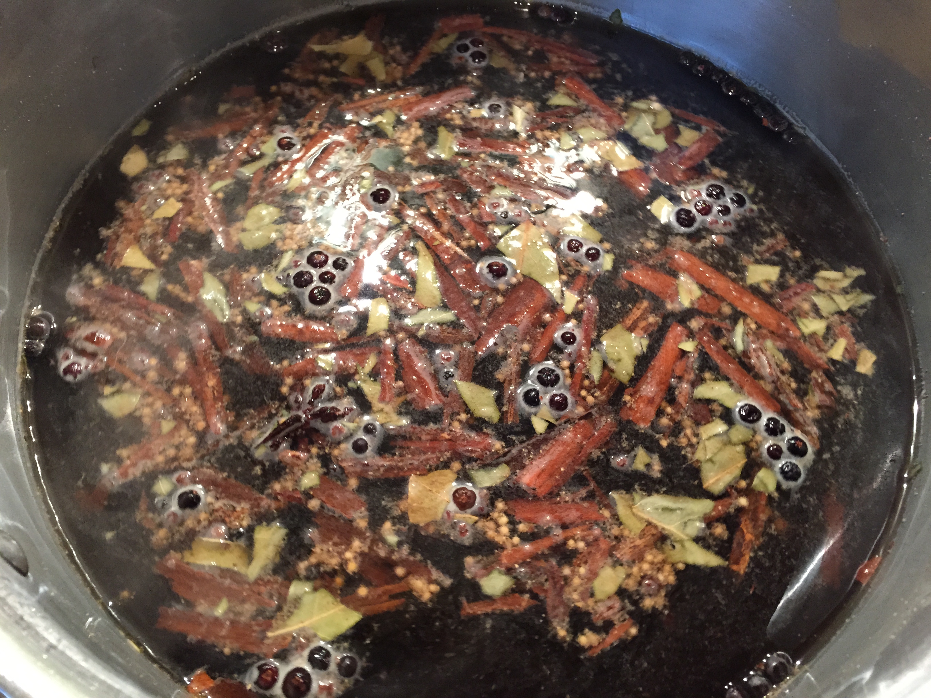 Combine all the spices with water and heat until all are dissolved and the liquid becomes less cloudy. Pour over ice to cool and then pour the whole thing over the brisket, which is then refrigerated for 10 days. Cook after that.