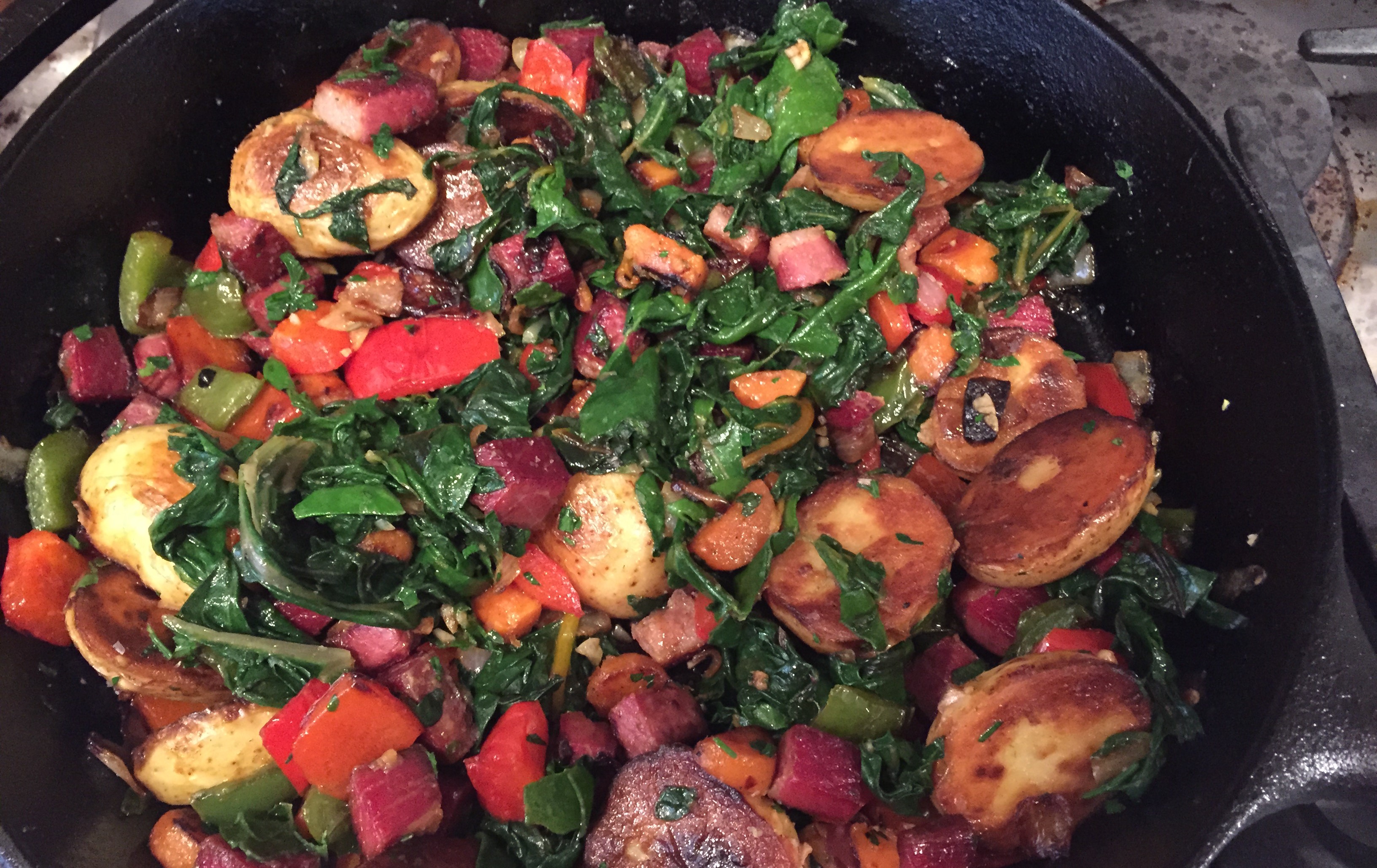 Lighten up a traditional corned beef hash by adding greens, different types of potatoes, herbs, and other vegetables.