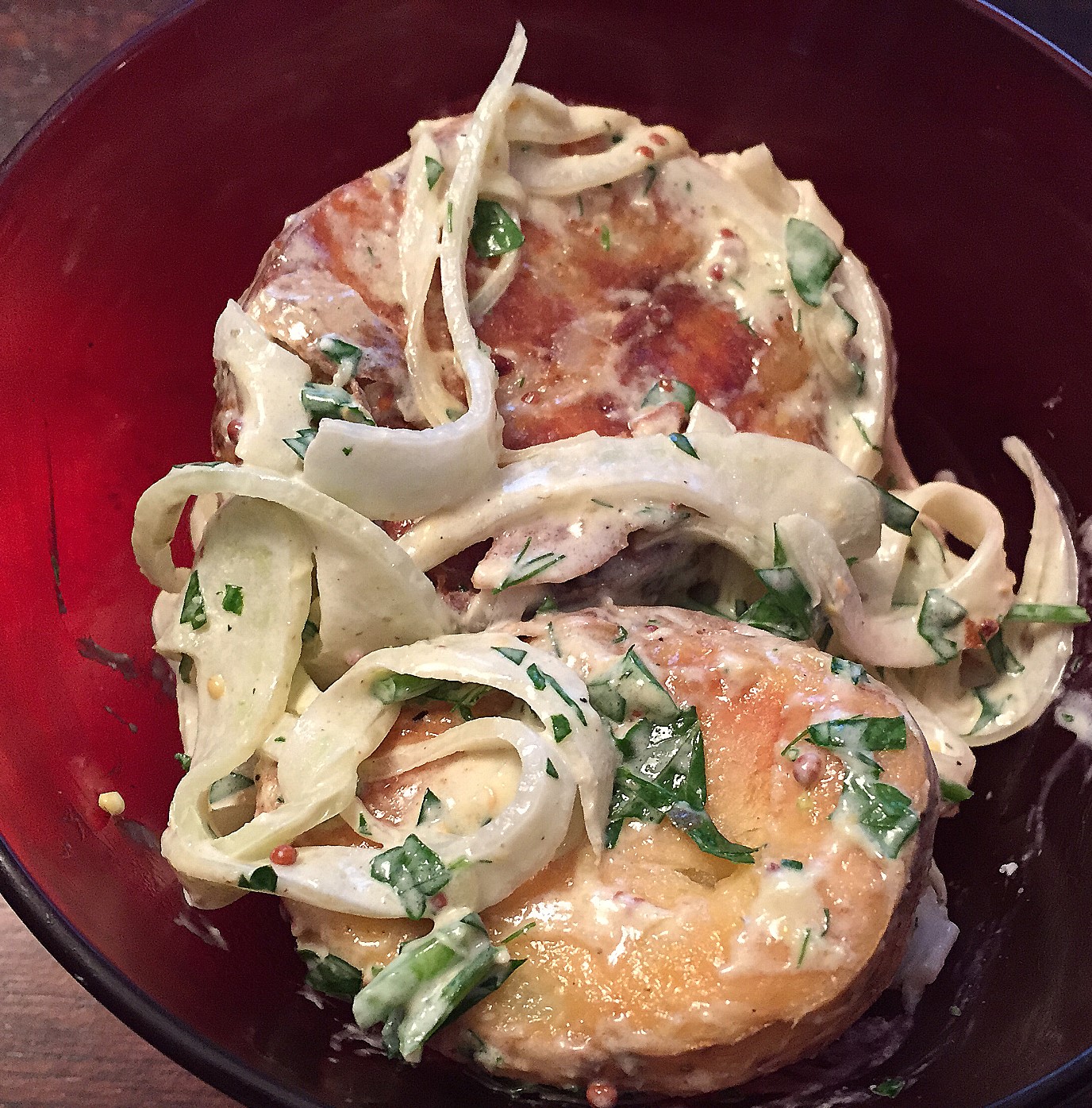 Next up…roasted potato salad with shaved fennel bound with a homemade spiced mayonnaise with two types of mustard. It’s really good and should be great for now and for Spring! Being in the Jerz lately, I cannot wait for Spring…