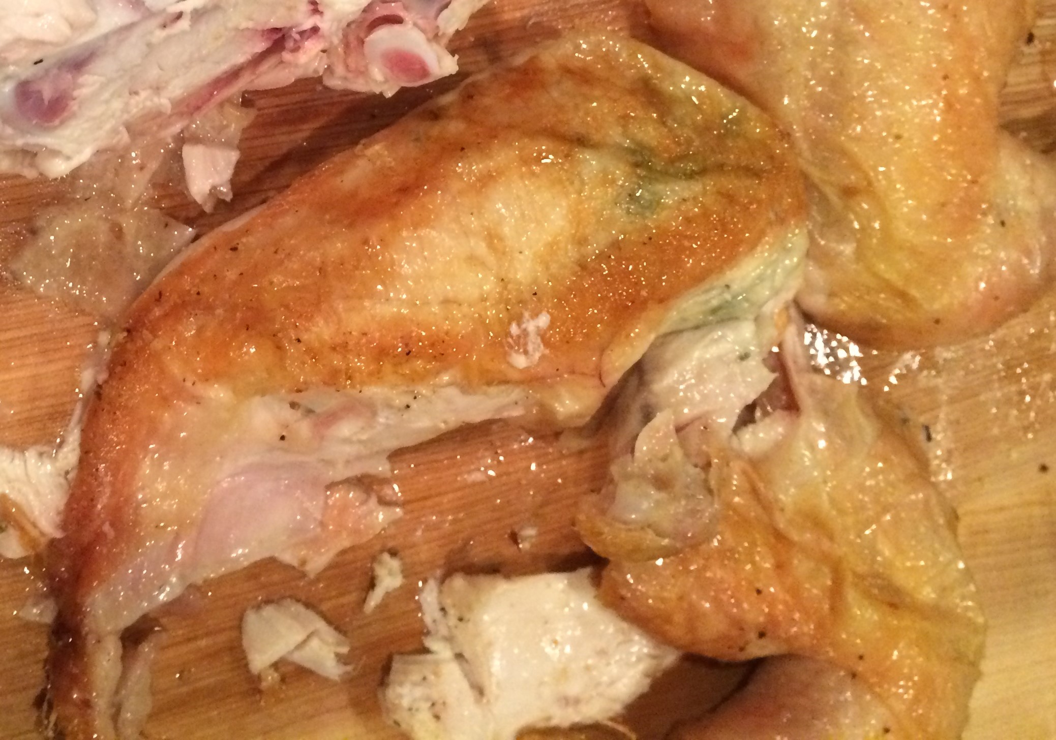 - When well rested, carve the chicken starting by moving a sharp knife between the leg and the side of the bird. Slide the knife down until you hit the joint between the thigh and the bird. Place the knife between those joints and separate it from the bird. Likewise do the same on the other side. Then remove the first two wing joints from the bird if you haven’t already done so. That then leaves the bird with a small wing drum joint. Carefully place your knife along the breast bone and slide the knife down along the carcass bones of the chicken carefully separating the breast from the carcass. Once the breast is mainly removed, slide the knife between the wing joint and the carcass and separate it, leaving the breast with wing joint in place. Do the same on the other side. Turn the chicken over and remove as much meat from the back as possible. Turn it back over and finish removing any remaining meat pieces on the top of the bird.